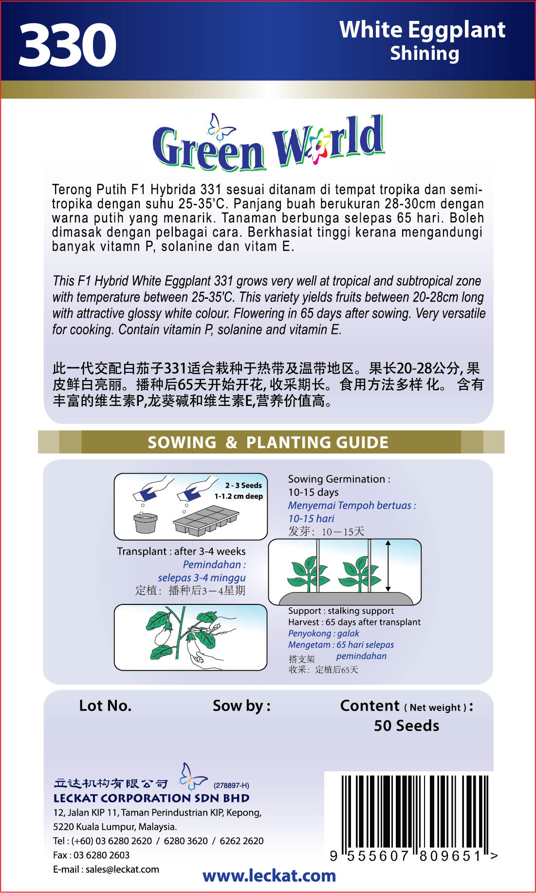 - Suitable for planting in tropical areas with a temperature of 25-35 degree Celsius. – Length 28-30cm with attractive white color.