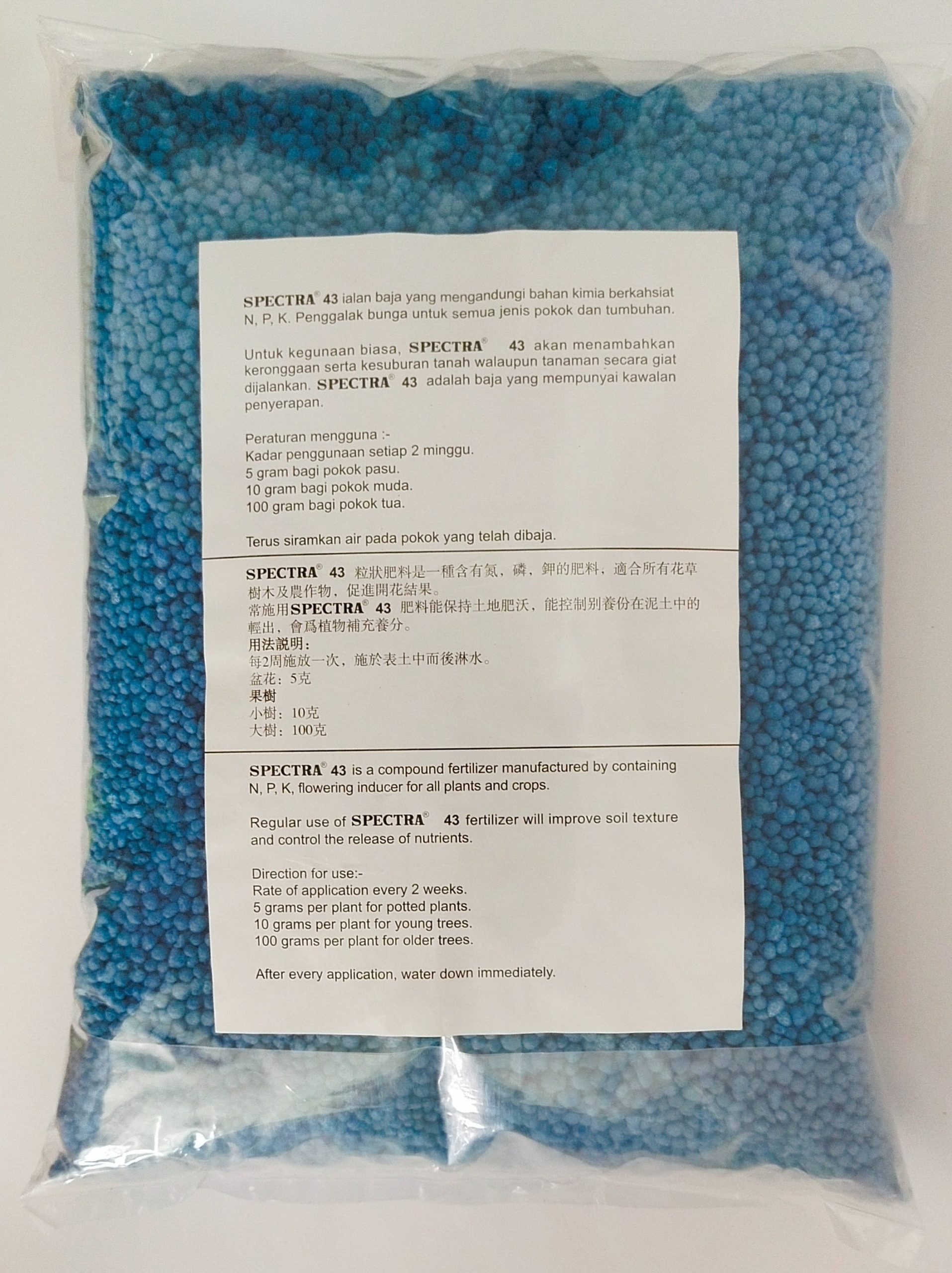 SPECTRA 43 ialah baja yang mengandungi bahan kimia berkahsiat N,P,K. Penggalak bunga untuk semua jenis pokok dan tumbuhan.